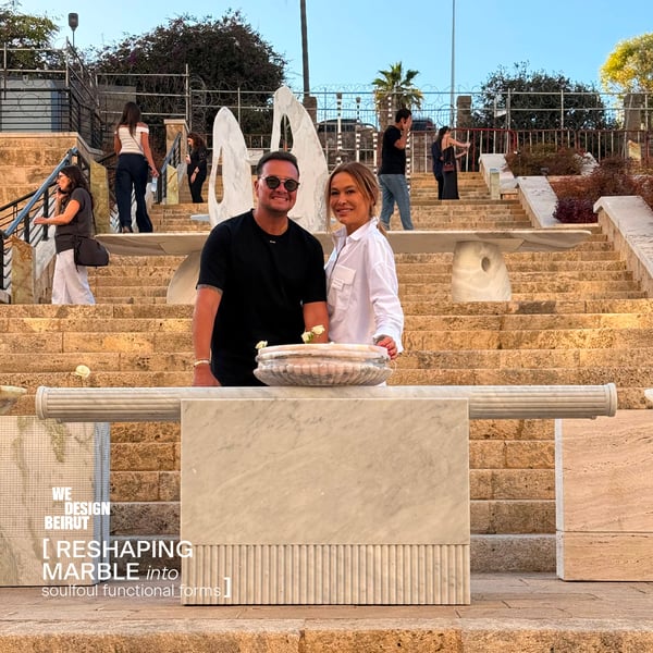 As part of We Design Beirut, Mohamed Fares presented Of Water & Stone, a site-specific installation designed for the Roman Baths of Beirut. The work introduces three marble structures Aroma, Longevity, and The Offering each shaped around a contemporary interpretation of ritual, materiality, and community Aroma features a carved marble diffuser with concentric channels guiding aromatic oils across stone, echoing ancient healing practices. Longevity uses two marble slabs and a minimal flower tray to symbolize endurance and the quiet presence of nature within the ruins. The Offering invites visitors to place flowers into designated openings, forming an evolving communal landscape that shifts throughout the day. Positioned within the historic baths, the installation creates a sensory narrative between architecture, nature, and human interaction. Through scent, texture, and collective participation, Fares reinterprets the site’s heritage in a modern spatial experience.